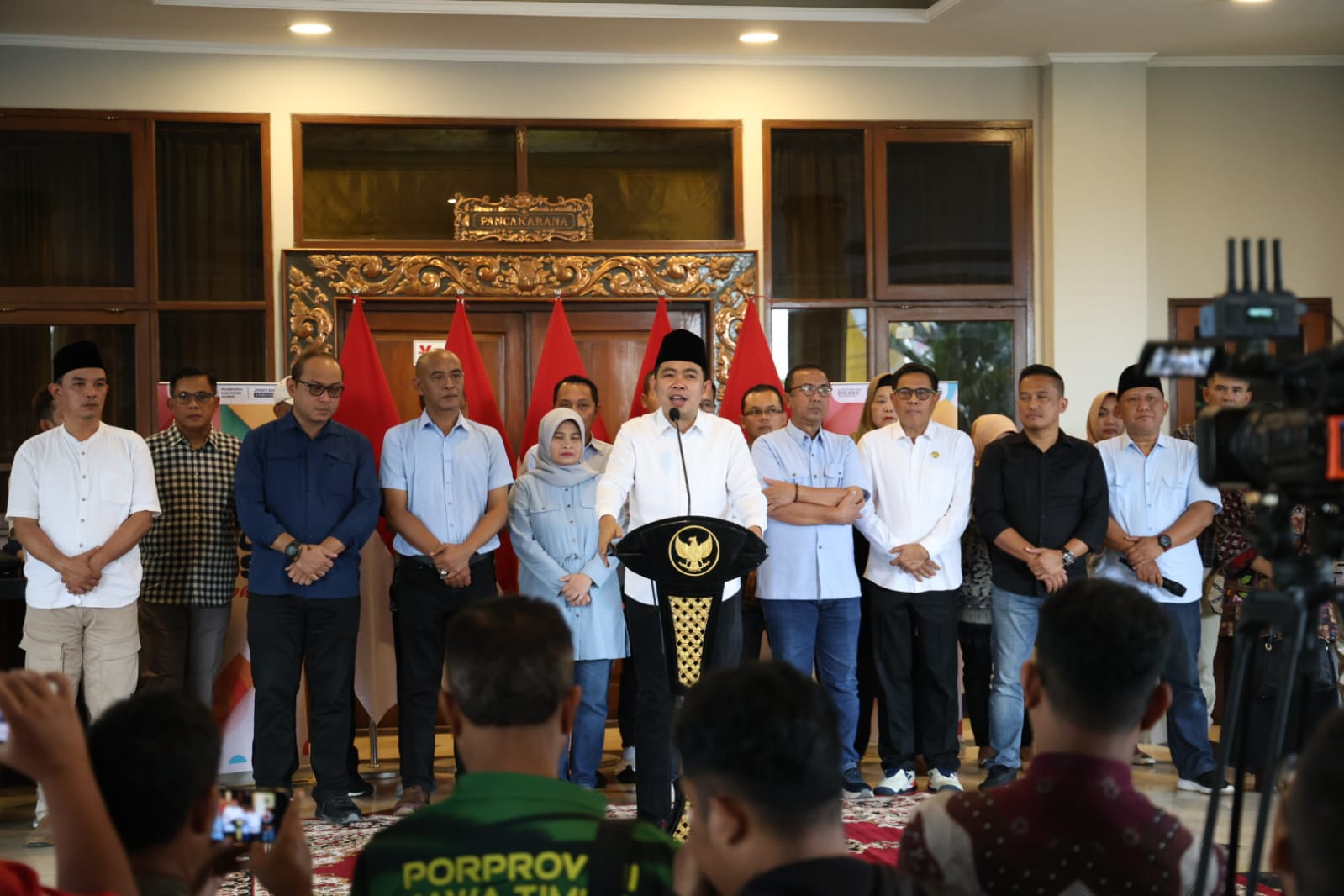 Bupati Jember Muhammad Fawait memberikan keterangan pers di Pendopo Wahyawibawagraha, Jember, Sabtu (31/1/2026), terkait pembentukan Satgas Infrastruktur dan Tata Ruang serta Satgas Pengetasan Kemiskinan, Stunting, dan AKI-AKB. (ist)