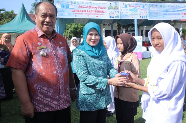ASAHAN, TEKAPE.co – Kegiatan aksi bergizi dan pembagian tablet tambah darah (TTD) bagi kalangan pelajar di sekolah diharapkan dapat melahirkan generasi yang sehat dan menjadi salah satu langkah pencegahan stunting di Kabupaten Asahan, sehingga generasi emas Tahun 2045 dapat tercapai. Hal itu disampaikan Bupati Asahan Taufik Zainal Abidin Siregar S.Sos, M.Si ketika membuka kegiatan aksi bergizi di SMA Negeri 1 Simpang Empat di Jalan Pasar Benteng Desa Sipaku Area, Kecamatan Simpang Empat – Asahan, Kamis (15/05/2025).