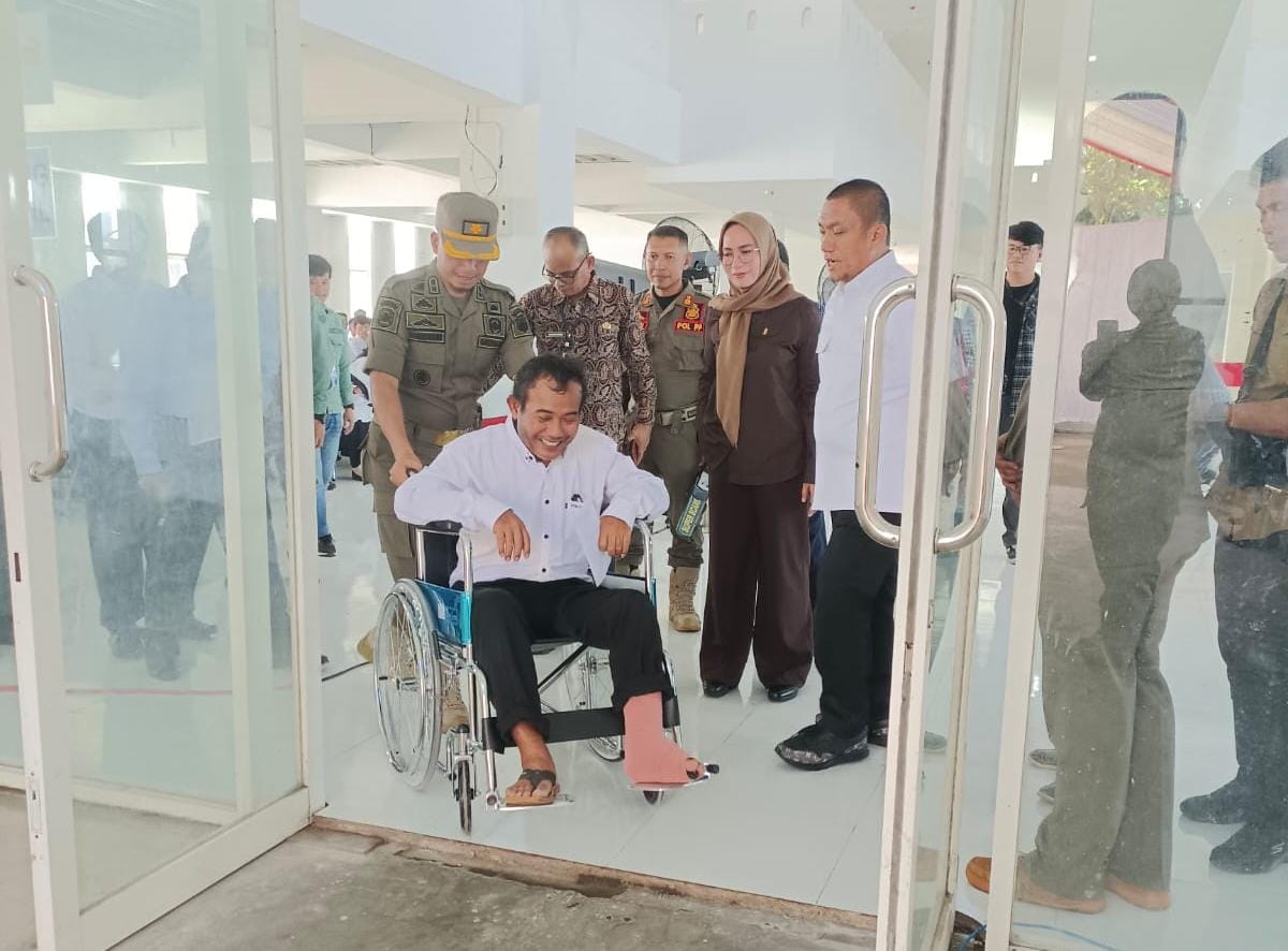 Seorang peserta tes PPPK Tahap II Luwu Timur menggunakan kursi roda saat memasuki ruang tes, yang disaksikan Bupati Luwu Timur Irwan Bachri Syam, di kampus Universitas Islam Makassar. (hms)