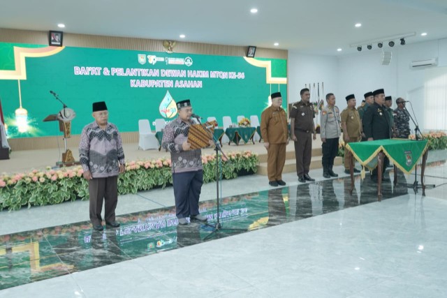 ASAHAN, TEKAPE.co – Bupati Asahan Taufik Zainal Abidin Siregar S.Sos, MSi secara resmi melantik dewan hakim Musabaqah Tilawatil Qur’an (MTQ) ke – 56 tingkat kabupaten. Dalam acara yang berlangsung di Aula Melati kantor bupati setempat, Senin (14/04/2025) itu, Taufik Zainal Abidin berharap kegiatan Musabaqoh Tilawatil Qur’an (MTQ) ini dapat menciptakan generasi pencinta Al-Quran terkhusus di wilayah Kabupaten Asahan. Selain itu, kata Taufik, pelaksanaan MTQ ini merupakan tempat untuk melihat hasil pembinaan dan seleksi yang dilakukan oleh desa dan kelurahan kepada para peserta.