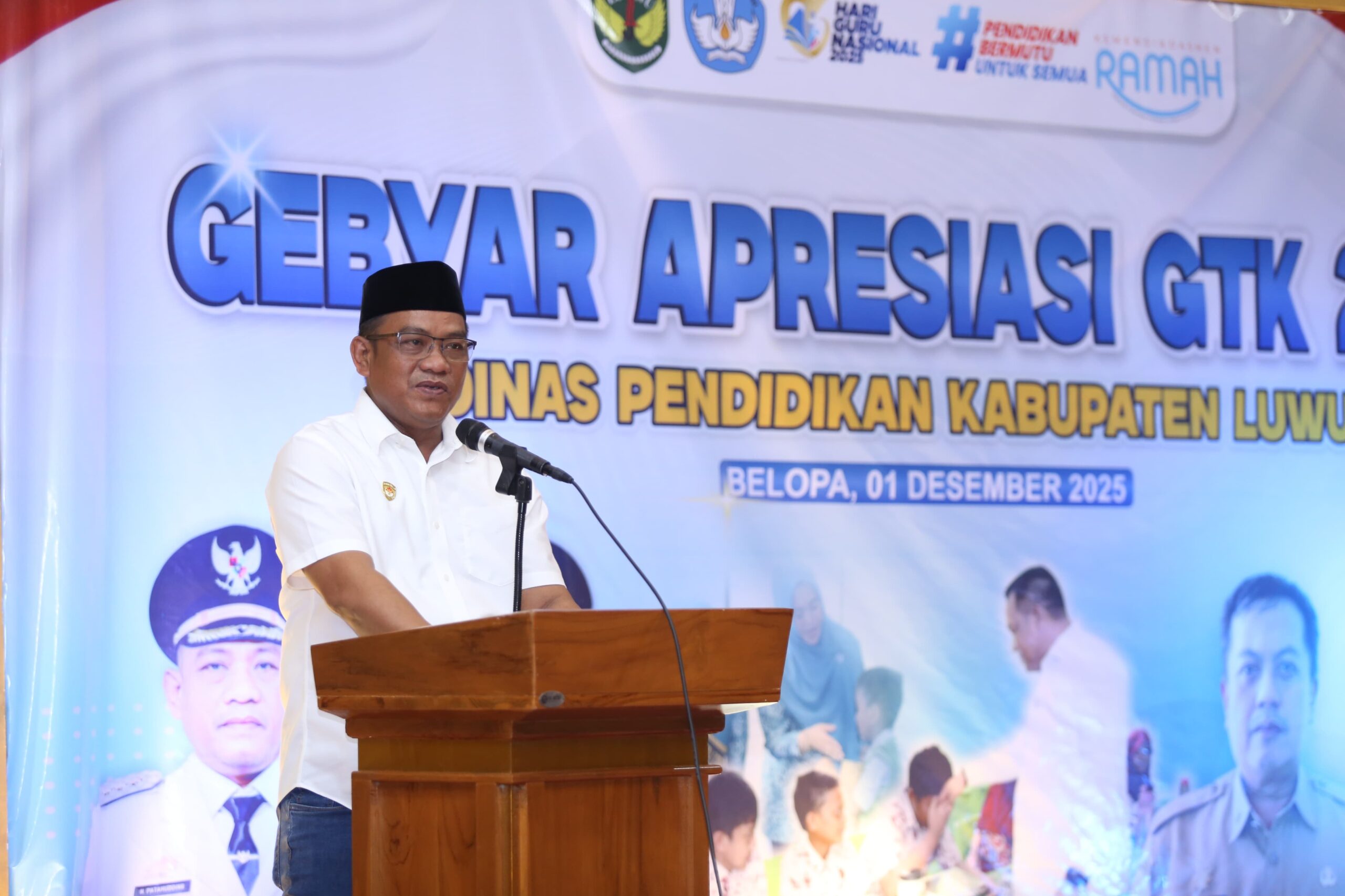 LUWU, TEKAPE.co – Bupati Luwu, Patahudding, resmi membuka kegiatan Gebyar Apresiasi Guru dan Tenaga Kependidikan (GTK) 2025 yang digelar Dinas Pendidikan Kabupaten Luwu di Gedung Esse Gallareng Belopa, Senin malam, 1 Desember 2025.