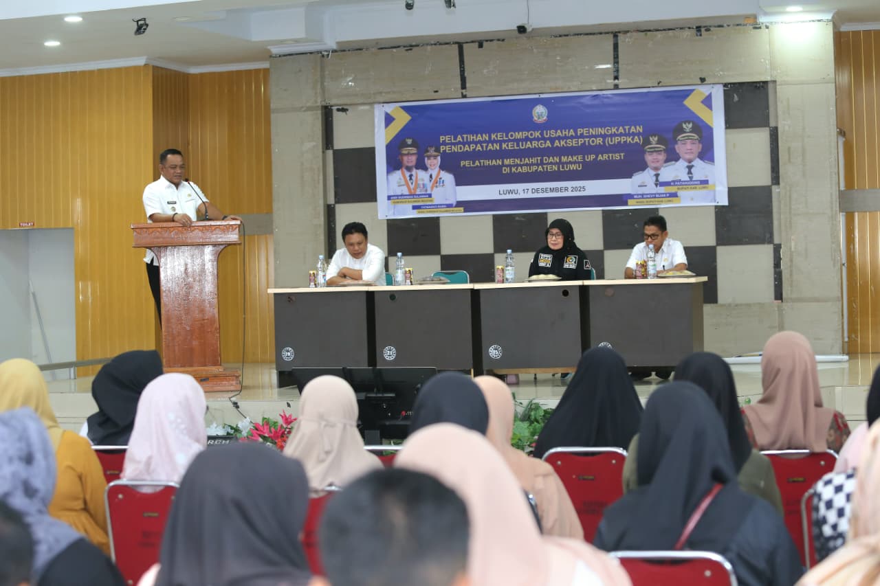 LUWU, TEKAPE.co – Bupati Luwu H. Patahudding membuka pelatihan Kelompok Usaha Peningkatan Pendapatan Keluarga Akseptor (UPPKA) berupa pelatihan menjahit dan Make Up Artist (MUA) di Aula Bappelitbangda Belopa, Rabu (17/12/2025).