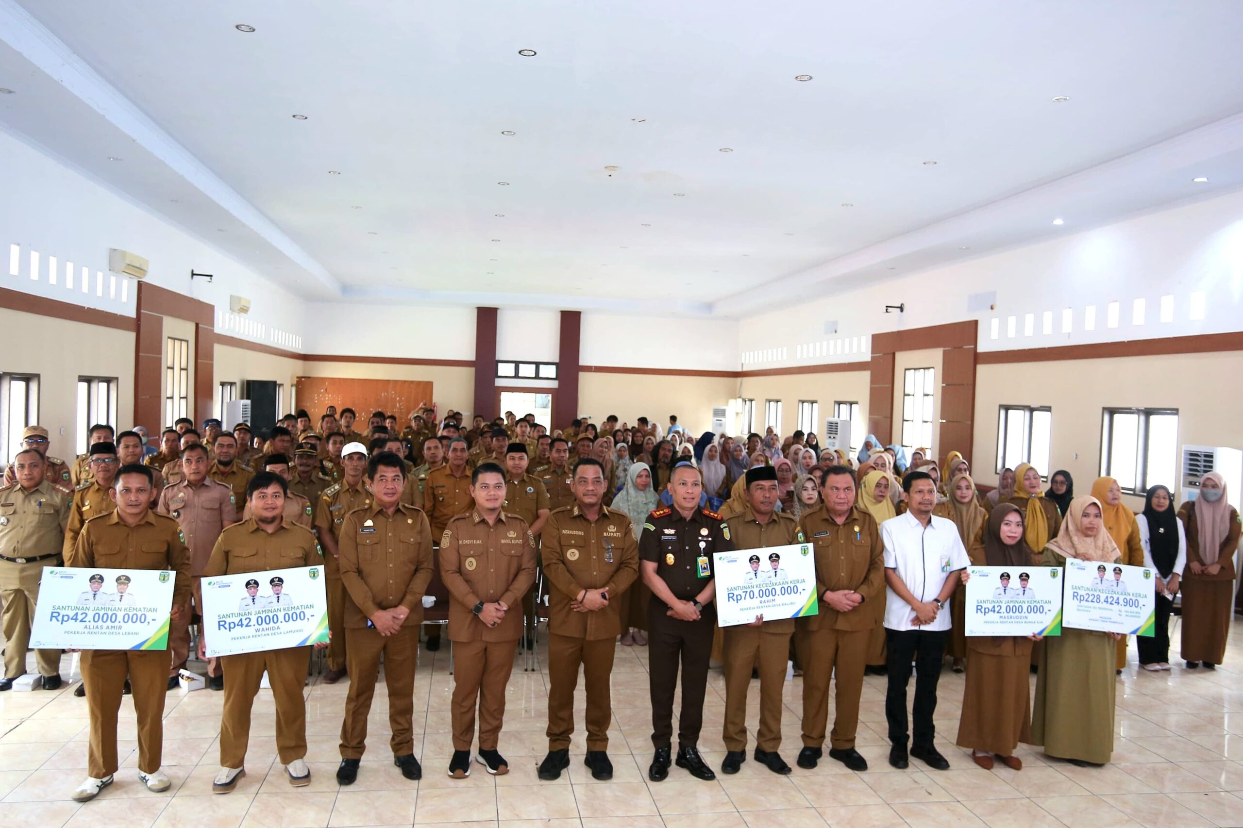 Dalam kesempatan tersebut, Bupati Luwu juga menyerahkan santunan kematian dan kecelakaan kerja kepada ahli waris pekerja rentan serta aparat desa yang telah meninggal dunia. (hms)