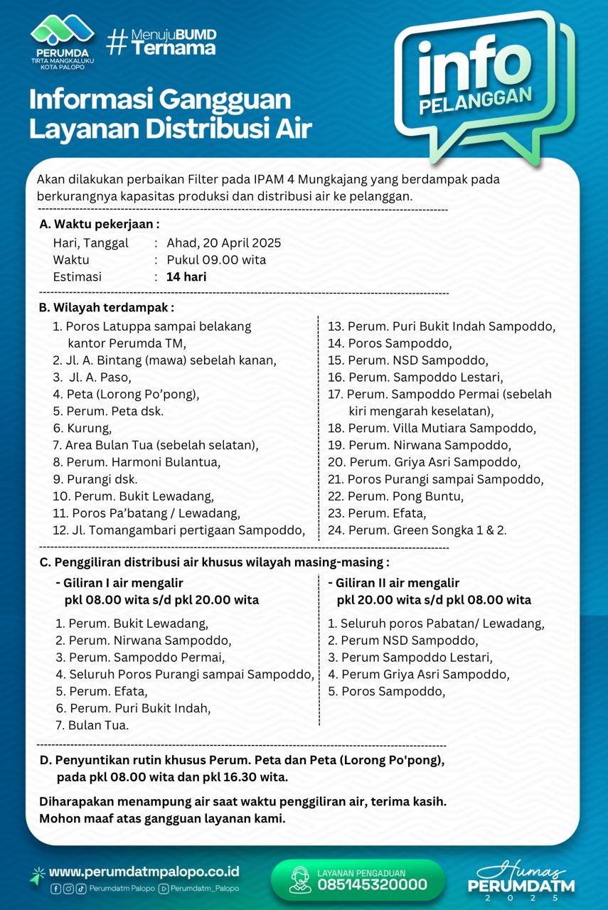 “Penyebab ganggua karena akan dilakukan perbaikan Filter pada IPAM 4 Mungkajang, Palopo, yang akan berdampak pada berkurangnya kapasitas dan distribusi air ke pelanggan,” tulis Perumda TM Palopo, Sabtu 19 April 2025.