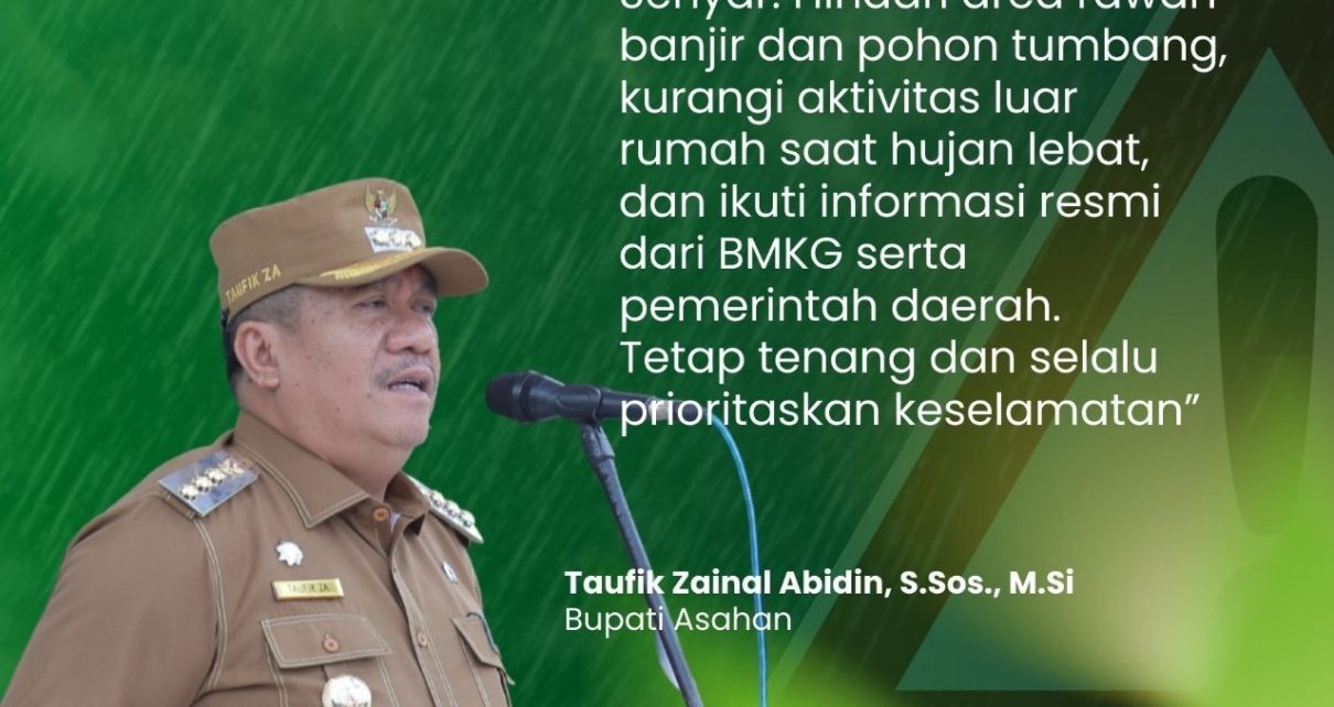 ASAHAN,TEKAPE.co — Menyikapi situasi terkini terkait cuaca ekstrim, Pemerintah Kabupaten Asahan mengimbau masyarakat untuk meningkatkan kewaspadaan, khususnya di wilayah rawan banjir, bantaran sungai, daerah pesisir, dan kawasan perbukitan yang berpotensi longsor.
