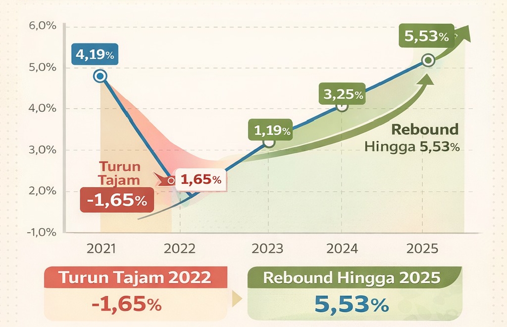 Sempat terpuruk akibat kontraksi -1,65 persen pada 2022, sektor ini kini perlahan bangkit. Dampak fluktuasi harga komoditas dan perubahan iklim yang sempat menekan petani mulai teratasi seiring membaiknya kondisi ekonomi nasional.