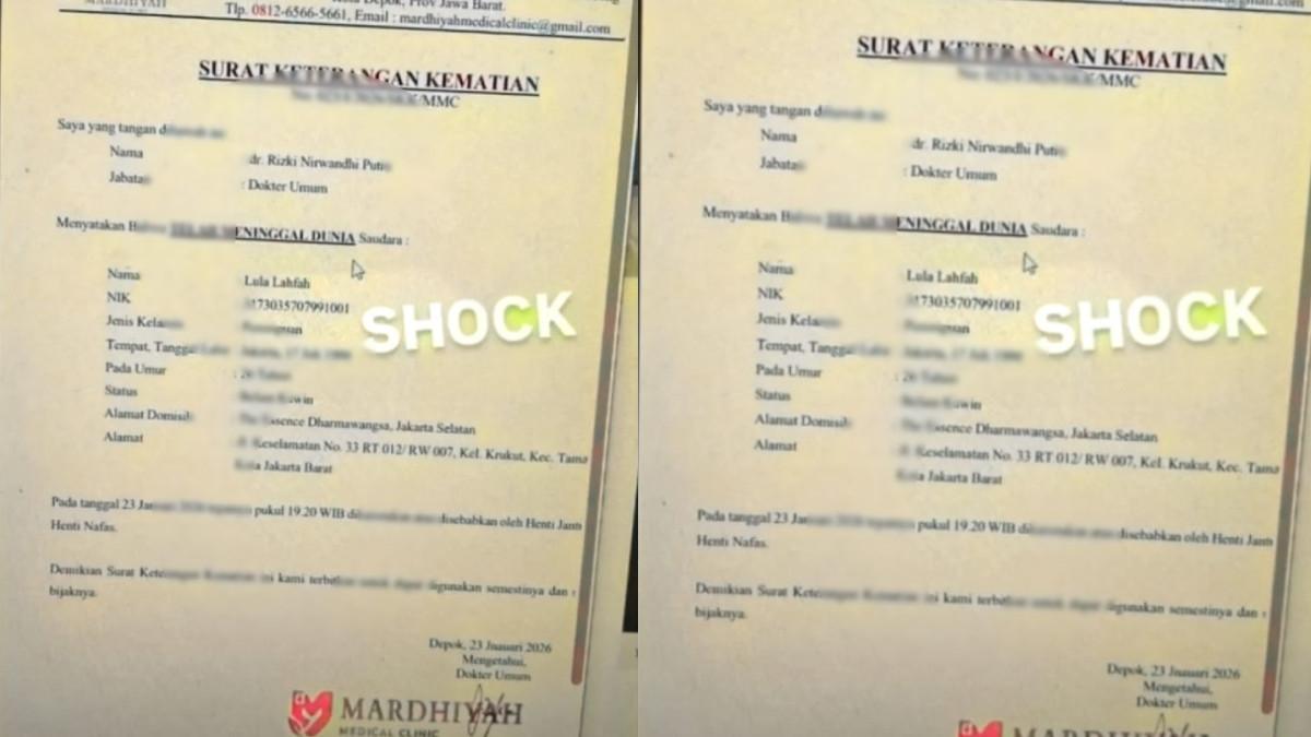 Surat Keterangan Kematian bernomor 023/I/2026/SKK/MMC dari Mardhiyah Medical Clinic menyatakan Lula meninggal akibat henti jantung.