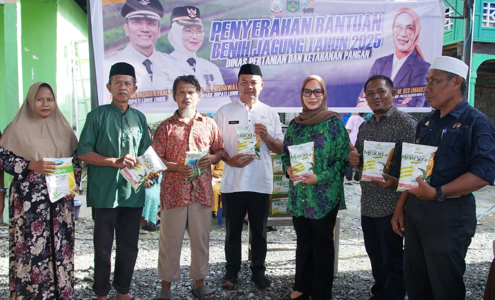 Ketua TP PKK Kabupaten Luwu Timur, sekaligus Anggota DPRD Provinsi Sulawesi Selatan, dr Ani Nurbani, menyerahkan bantuan benih jagung kepada kelompok masyarakat di Desa Tampinna, Kecamatan Malili, Jumat 5 Desember 2025.