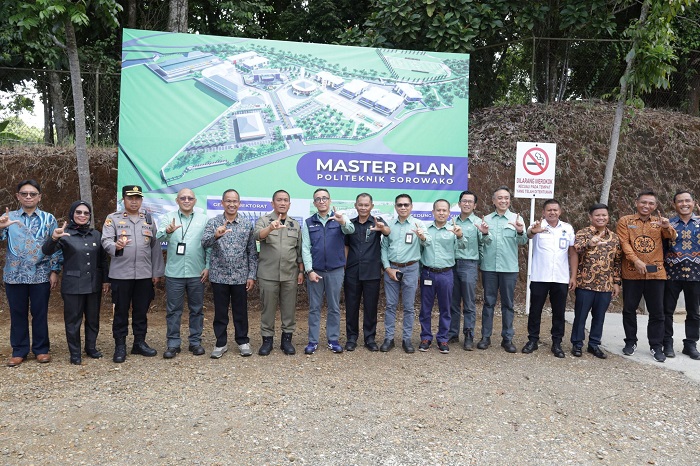 Foto bersama pada acara Peletakan Batu Pertama Pembangunan Gedung Perkuliahan dan Peresmian Papan Nama Politeknik Sorowako (Poliwako), Kampus Politeknik Sorowako, Kecamatan Nuha, Kamis (04/12/2025). (hms)