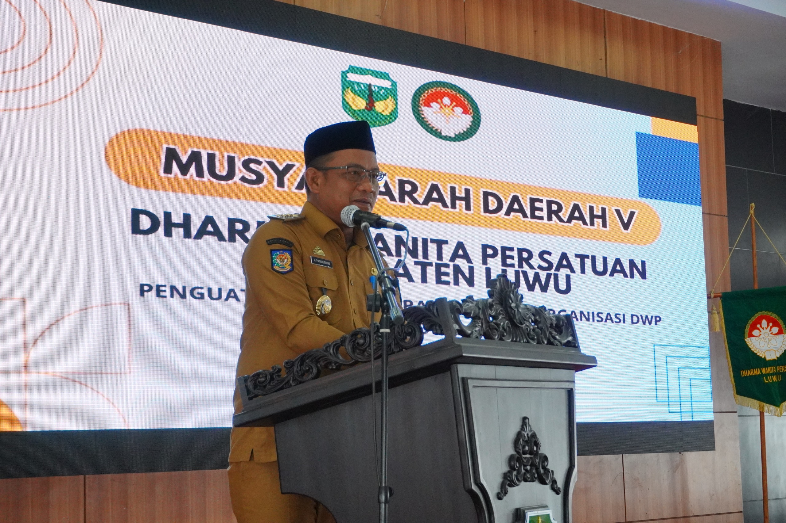 Bupati Luwu, H. Patahudding, S.Ag, saat menyampaikan sambutan sekaligus membuka secara resmi Musyawarah Daerah (Musda) V Dharma Wanita Persatuan (DWP) Kabupaten Luwu di Ruang Pola Andi Kambo, Kompleks Perkantoran Bupati Luwu, Senin (30/6/2025). (ist)