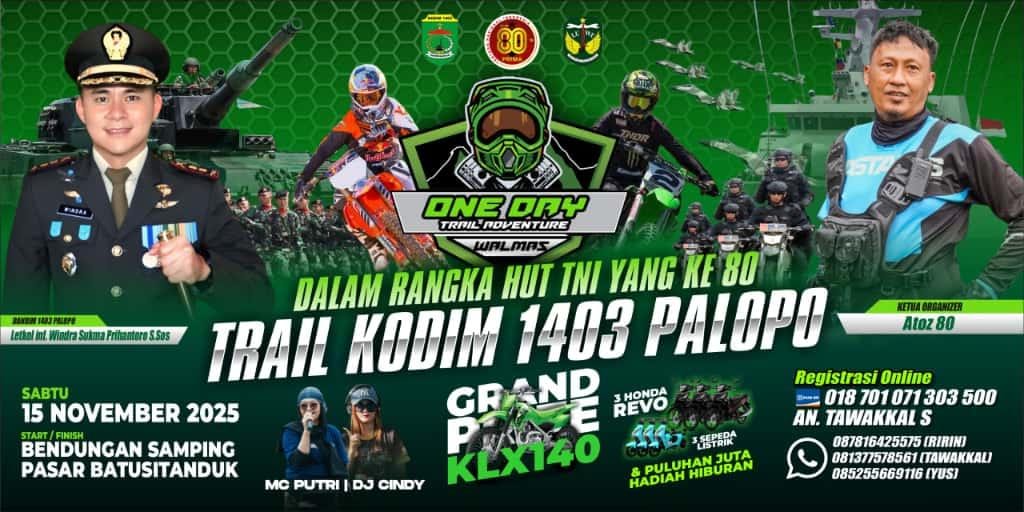 PALOPO, TEKAPE.co – Untuk memeriahkan Hari Ulang Tahun ke-80 Tentara Nasional Indonesia (TNI), Kodim 1403/Palopo akan menggelar One Day Trail Adventure Walenrang Lamasi pada 15 November 2025.