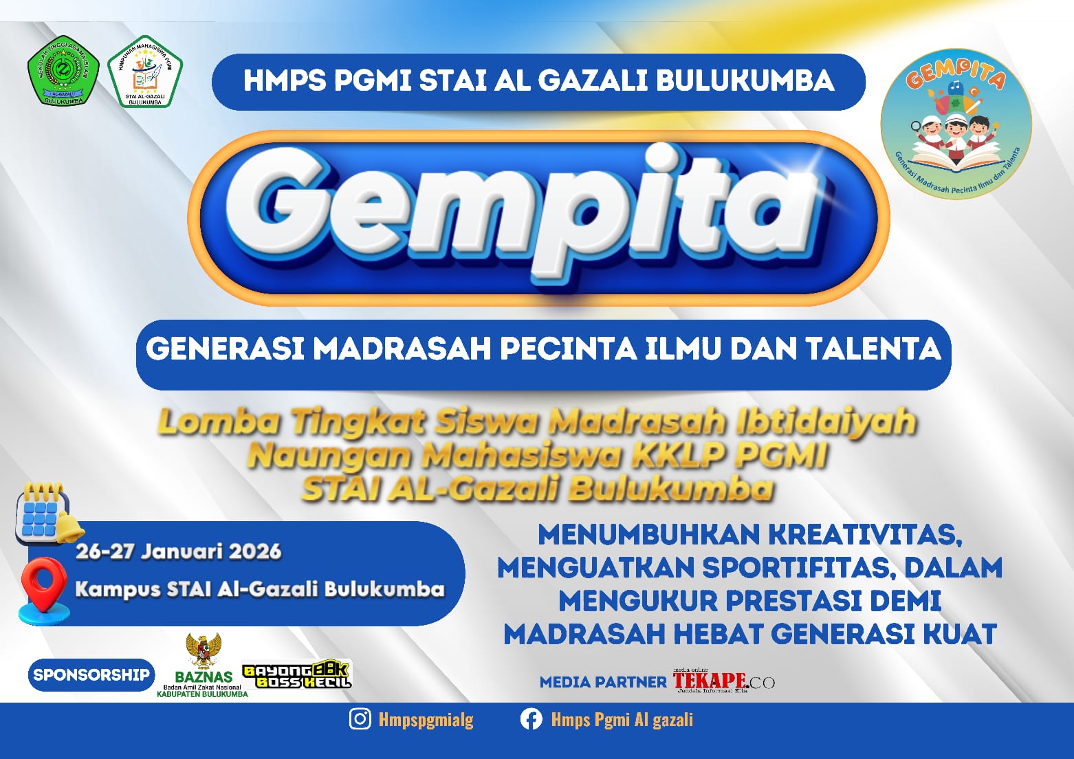 BULUKUMBA, TEKAPE.co – Pengurus Himpunan Mahasiswa Program Studi (HMPS) PGMI STAI Al Gazali Bulukumba dijadwalkan akan segera menggelar kegiatan bergengsi bertajuk GEMPITA (Generasi Madrasah Pecinta Ilmu dan Talenta) pada tanggal 26–27 Januari 2026 mendatang.