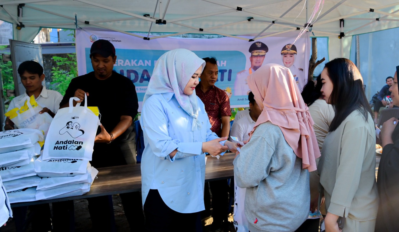 Wakil Gubernur Sulsel, Fatmawati Rusdi hadir langsung membagikan beras kepada warga. Ia menyapa satu per satu masyarakat yang antre sambil memastikan distribusi berjalan tertib.