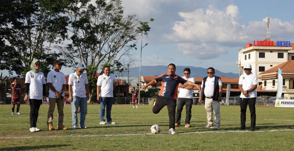 Bupati Luwu Timur, H Irwan Bachri Syam menendang bola sebagai simbol dibukanya turnamen, yang disaksikan Pimpinan DPRD Jihadin Paruge alias Lau Jiha, pada pembukaan Turnamen Nickel Cup IX di Lapangan Persesos, Kecamatan Nuha, Minggu (12/10/2025). (hms)