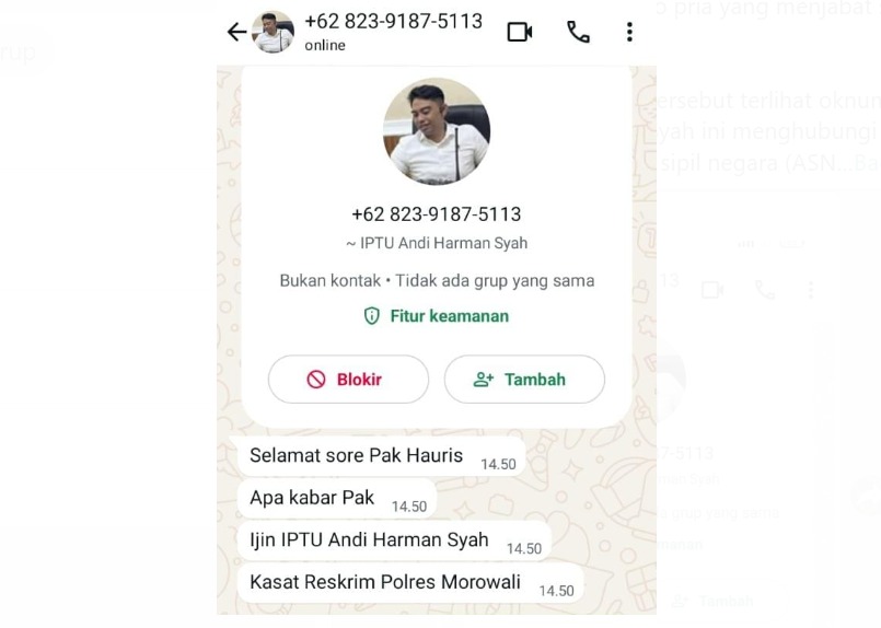 Berdasarkan informasi yang dihimpun, pelaku menggunakan nomor WhatsApp palsu dengan nomor +62 823-9187-5113 dan mengaku sebagai IPTU Andi Harman Syah.