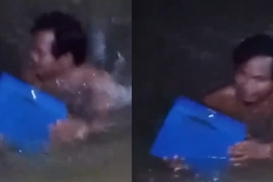 Tangkapan layar video amatir memperlihatkan warga menemukan brankas berwarna biru yang diduga milik agen BRILink di aliran sungai wilayah Kecamatan Walenrang, Kabupaten Luwu. Brankas tersebut sebelumnya disebut dibuang pelaku usai perampokan.