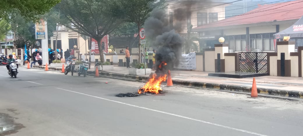 Pantauan Tekape.co, massa membakar ban bekas di depan kantor polisi tersebut.