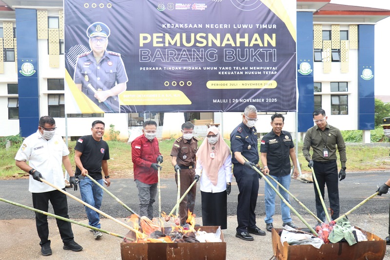 MALILI, TEKAPE.co – Kejaksaan Negeri Luwu Timur (Lutim) kembali menggelar pemusnahan barang bukti yang telah berkekuatan hukum tetap dengan amar putusan dirampas untuk dimusnahkan periode Juli hingga November 2025, di halaman kantor Kejaksaan Negeri Lutim, Rabu (26/11/2025).