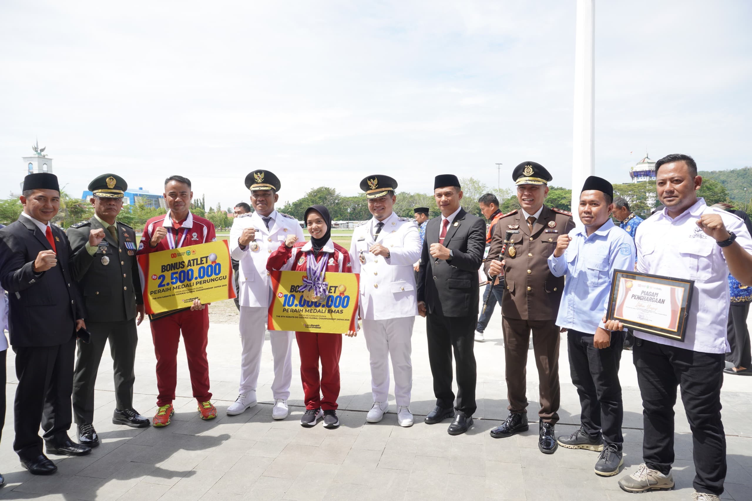 Para atlet berprestasi asal Luwu berfoto bersama Bupati Luwu H Patahudding, dan Wabup Luwu, Muh Dhevy Bijak, Ketua DPRD Luwu, Ahmad Ghazali, Kepala Kejaksaan Negeri Luwu, Wakil Ketua DPRD Luwu, Zulkifli, Ketua KONI Luwu, dan jajaran Forkopimda, usai menerima piagam penghargaan serta bonus pembinaan pada upacara HUT RI ke-80 di Lapangan Andi Djemma Belopa, Minggu, (17/8/2025). (ist)