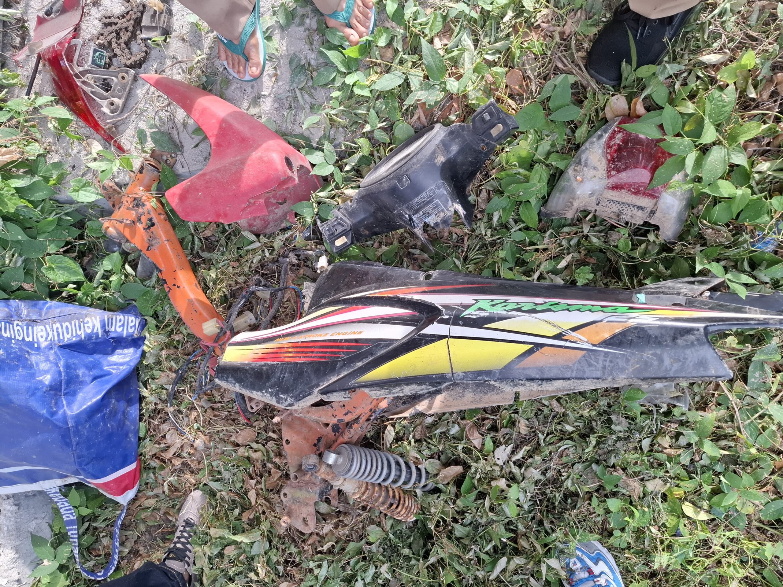 Komponen penting seperti shockbreaker, lampu, serta kabel-kabel kelistrikan terlihat berserakan dan mengalami kerusakan parah. Motor tersebut bahkan tergeletak terpisah dari kendaraan lainnya di atas tanah.