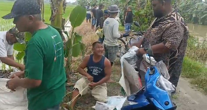 “Hari ini ada 50 orang warga ikut gotong-royong untuk menimbun tanggul dengan menggunakan tanah dan pasir, yang di masukan ke dalam karung, ” terang supriadi.