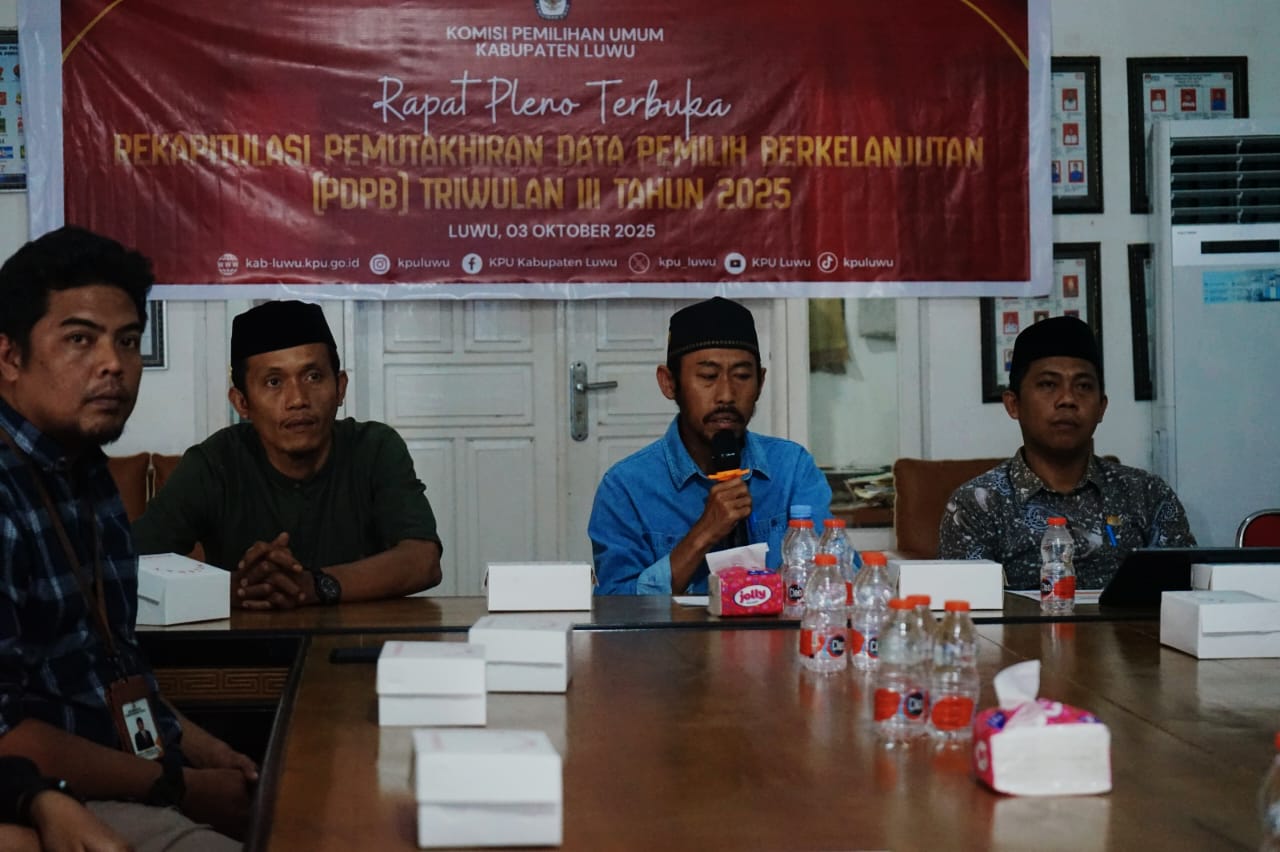 Plh. Ketua KPU Kabupaten Luwu, Suherman, memimpin rapat pleno terbuka penetapan Daftar Pemilih Berkelanjutan (DPB) Triwulan III Tahun 2025 di Kantor KPU Luwu, Jumat (3/10/2025). (ist)