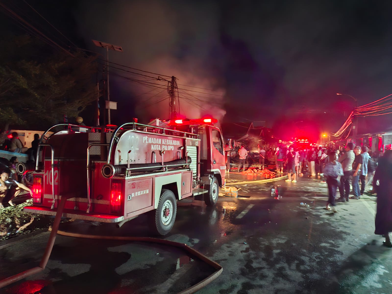 Petugas pemadam kebakaran berjibaku memadamkan kobaran api yang melalap kios-kios di Pasar Andi Tadda, Kota Palopo, Sulawesi Selatan, Selasa (27/1/2026) dini hari. (ist)