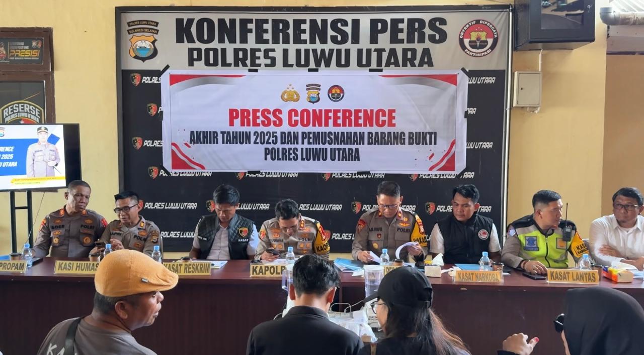 Kasat Lantas Polres Luwu Utara AKP Yusri menyampaikan rilis data kecelakaan dan pelanggaran lalu lintas tahun 2024–2025 dalam konferensi pers. (ist)