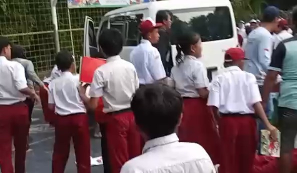 Dalam kondisi murid-murid berdiri rapi, suara deru mesin kendaraan terdengar dari luar pagar.