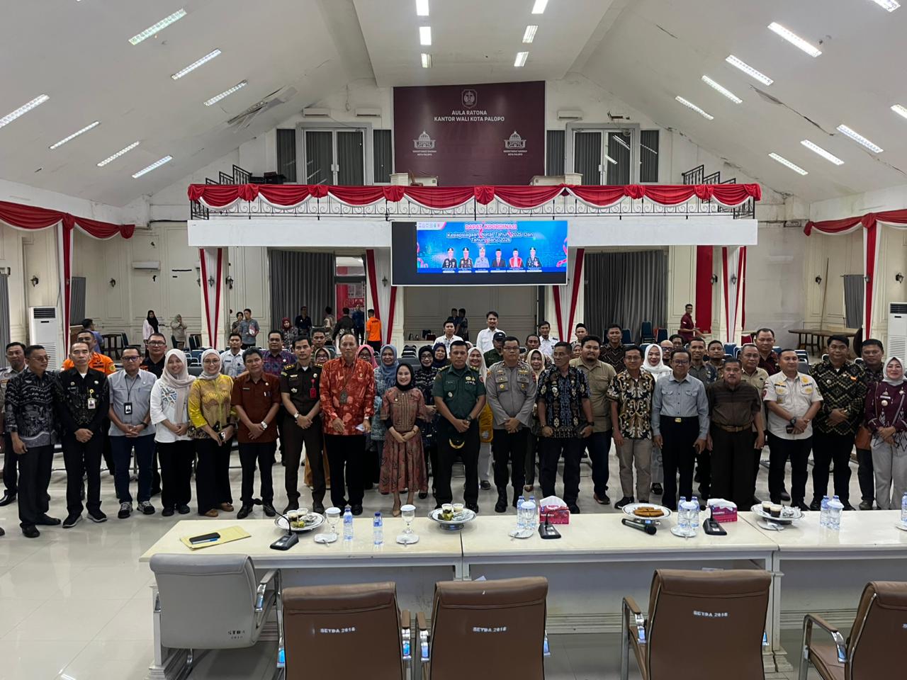 Wali Kota Palopo, Naili, berfoto bersama unsur Forkopimda, pimpinan OPD, camat, dan lurah se-Kota Palopo usai Rapat Koordinasi Kesiapsiagaan Natal 2025 dan Tahun Baru 2026 di Aula Ratona, Kamis (18/12/2025). (Dok: Hendra)