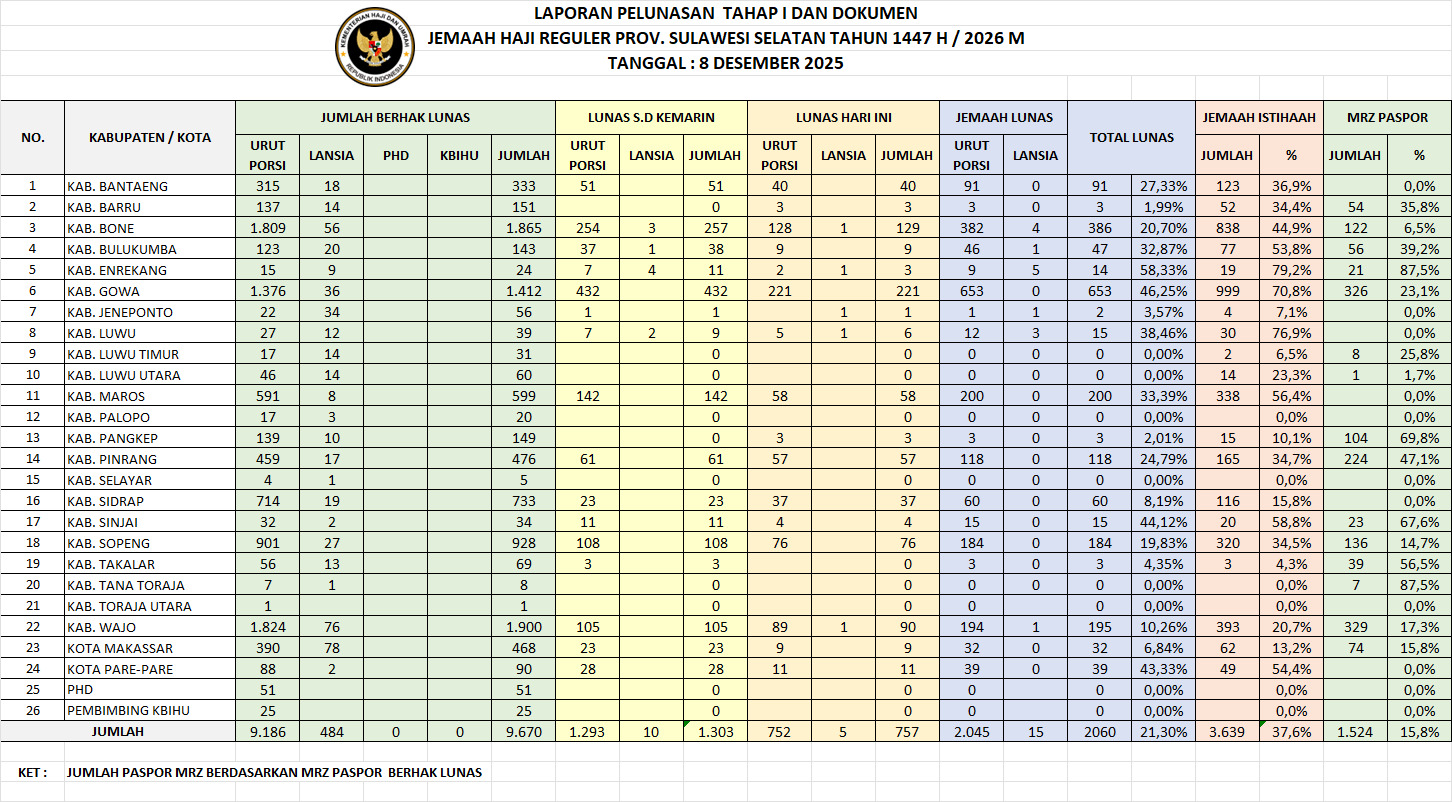 Kakanwil Kemenhaj Sulsel, H. Ikbal Ismail, mengatakan batas akhir pelunasan Tahap I jatuh pada 23 Desember 2025. Hingga saat ini, kata dia, baru sekitar 20 persen atau 2.000-an jemaah dari total 9.670 jemaah Sulsel yang telah melakukan pelunasan.