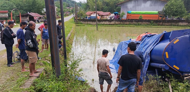 Truk Tangki Diduga Memuat Solar Subsidi Terjun ke Sawah di Tondon Toraja
