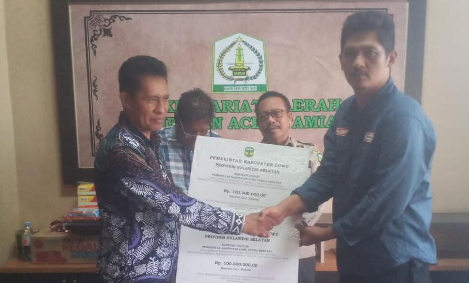 Bantuan diserahkan oleh Asisten Bidang Pemerintahan dan Kesejahteraan Rakyat Sekretariat Daerah Kabupaten Luwu, Ahyar Kasim, kepada Kepala Pelaksana Badan Penanggulangan Bencana Daerah (BPBD) Kabupaten Aceh Tamiang, Imam Suhery.