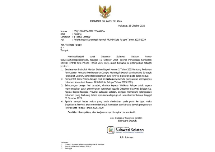 “Apabila batas waktu sebagaimana disebutkan dalam poin ketiga surat tersebut tidak dipenuhi, maka Inspektorat Provinsi Sulawesi Selatan akan menindaklanjuti hambatan dan kendala terkait penyusunan RPJMD Kota Palopo Tahun 2025–2029,” demikian bunyi peringatan dalam surat gubernur itu.