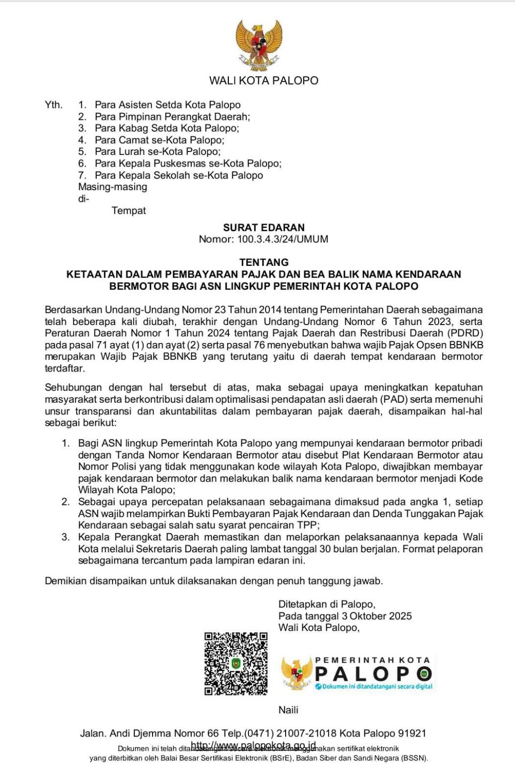 PALOPO, TEKAPE.co – Terbitnya Surat Edaran (SE) Wali Kota Palopo Nomor 100.3.4.3/24/UMUM tertanggal 3 Oktober 2025 tentang Ketaatan dalam Pembayaran Pajak dan Bea Balik Nama Kendaraan Bermotor bagi ASN Lingkup Pemerintah Kota Palopo menuai sorotan publik.