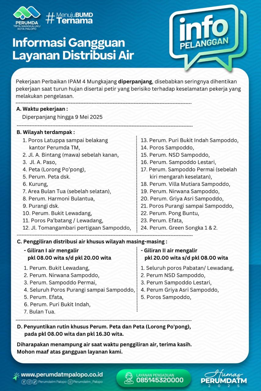 Dalam rilis yang diterima Tekape.co, Minggu, 4 Mei 2025, Perusahaan Umum Daerah Air Minum (Perumda) Tirta Mangkaluku (TM) Palopo mengonfirmasi bahwa perpanjangan masa perbaikan ini tak lepas dari kendala cuaca.