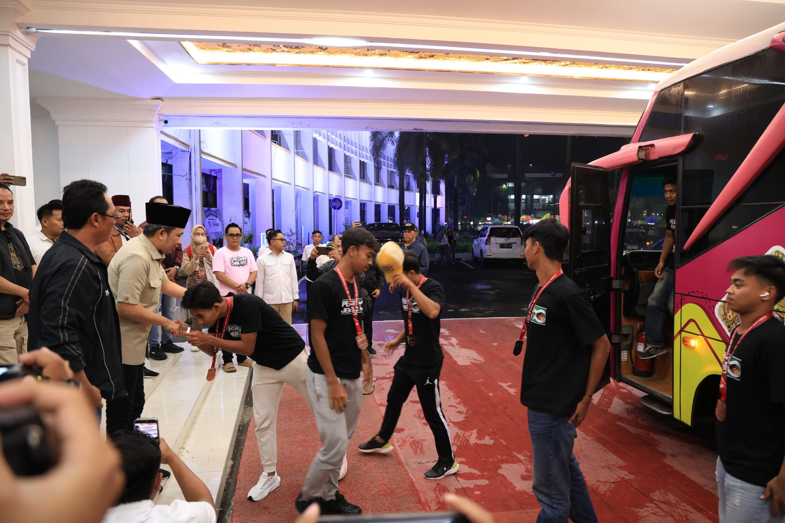 Bupati Jember Muhammad Fawait menyambut langsung kedatangan para pemain dan ofisial di Hall Prajamukti Kantor Pemkab Jember, Senin (16/2/2026).