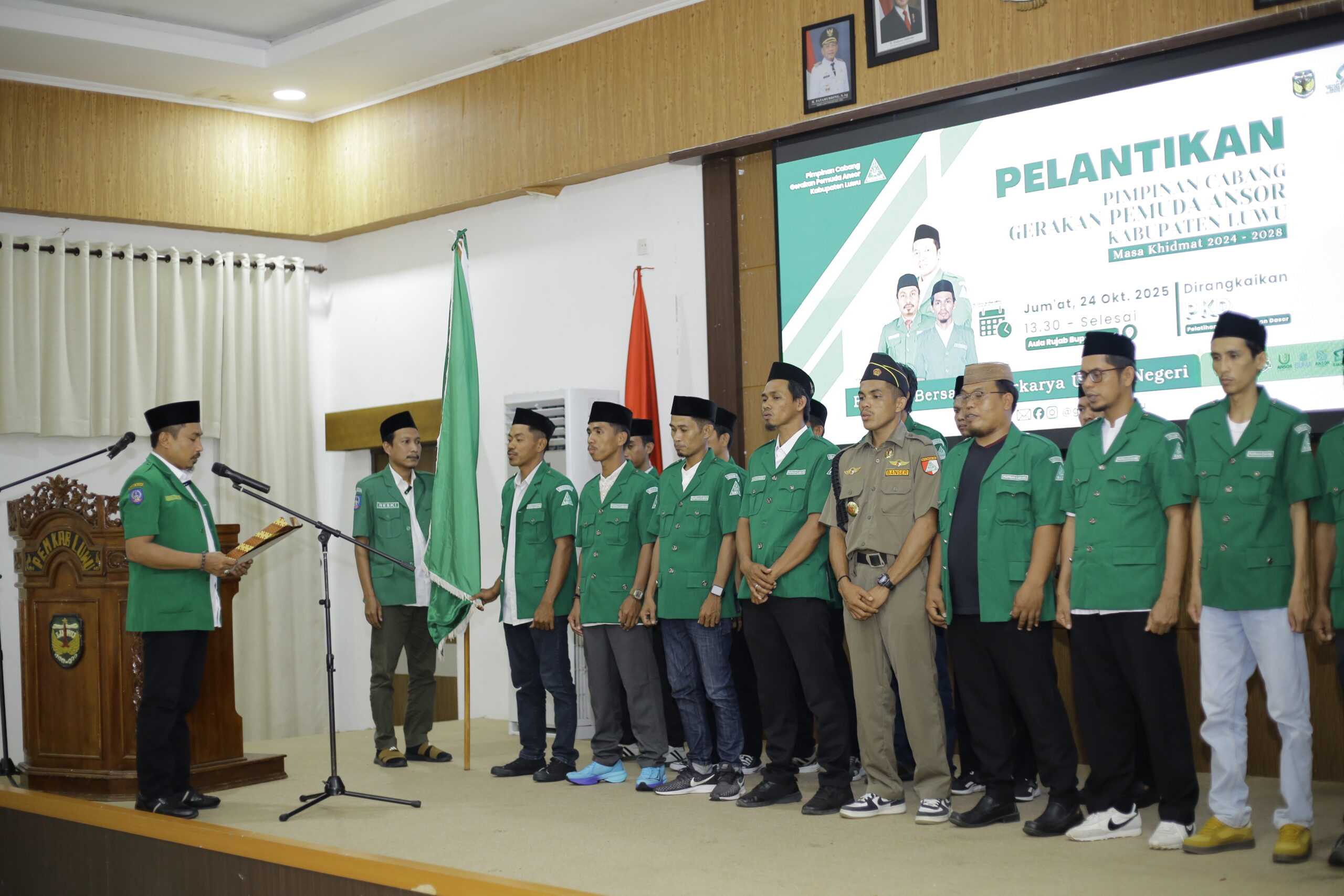 Ketua Pengurus Wilayah Gerakan Pemuda (GP) Ansor Sulawesi Selatan, Rusdi Idrus (kiri), Saat Melantik Pimpinan GP Ansor Kabupaten Luwu masa khidmat 2024–2028 di Aula Rumah Jabatan Bupati Luwu, Belopa Utara, Jumat (24/10/2025). (ist)