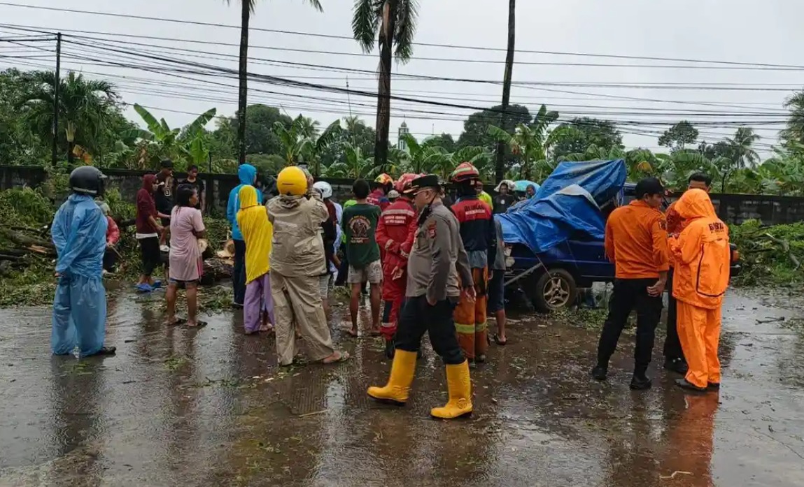 Pohon yang roboh menimpa seorang warga yang tengah berjualan rambutan di bahu jalan.
