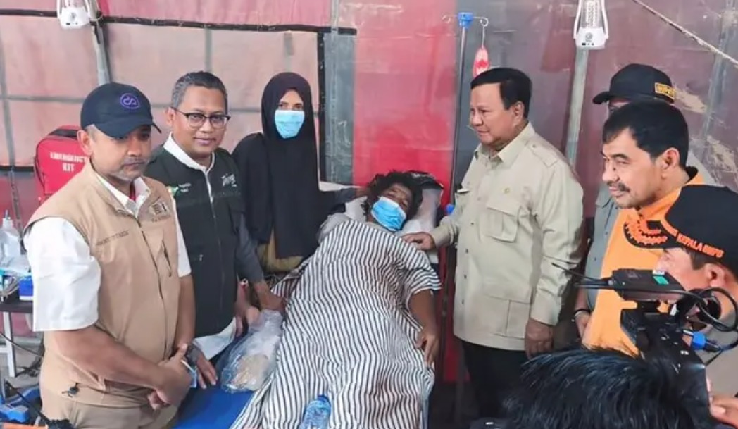 Presiden Prabowo Subianto meninjau Posko Kesehatan Pegadaian Peduli di Kuala Simpang, Jumat (12/12/2025), untuk memastikan pelayanan bagi para penyintas berjalan efektif.
