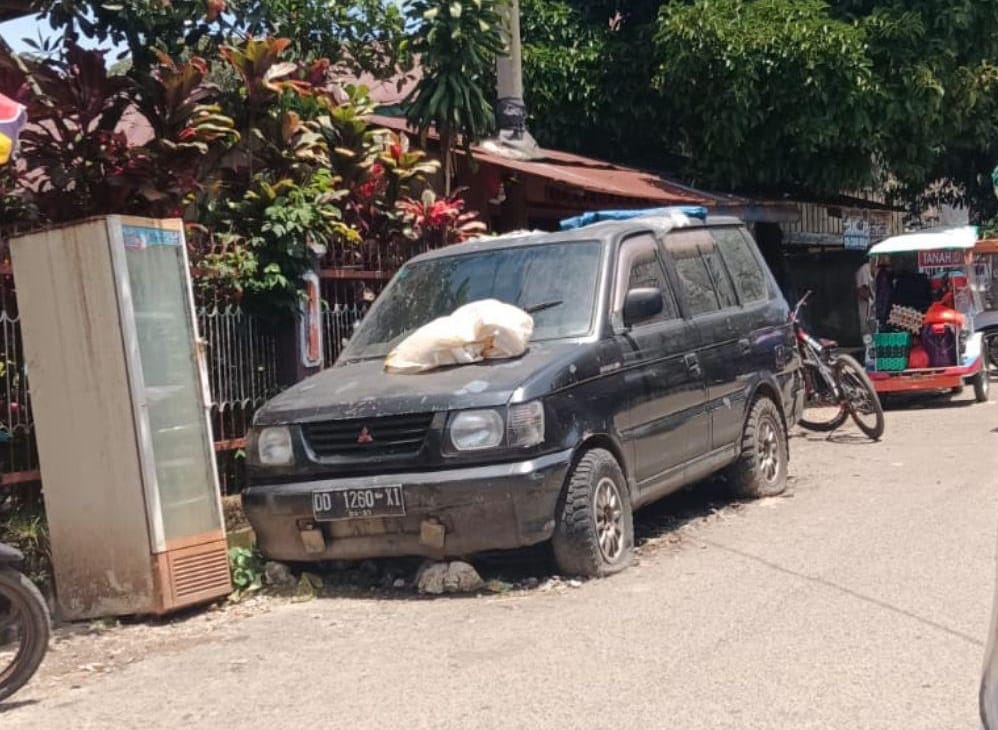 Salah satu mobil dalam kondisi rusak terparkir di bahu jalan di wilayah Rantepao, Toraja Utara, Minggu (15/2/2026). (ist)