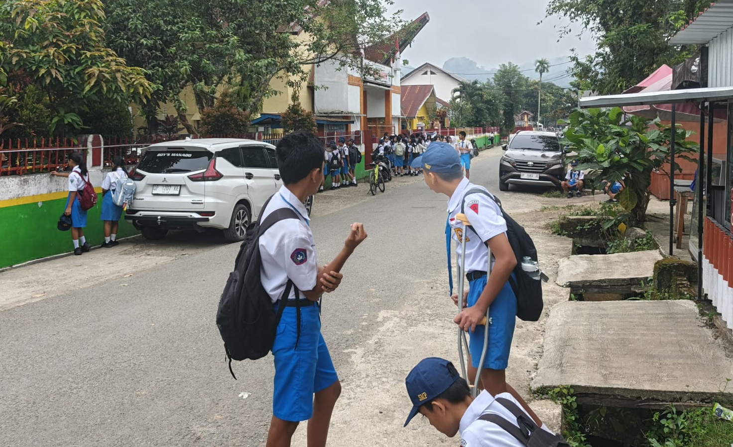 Dengan kondisi masih menggunakan tongkat penyangga, ia tetap harus berdiri di luar area sekolah sambil menunggu gerbang dibuka.