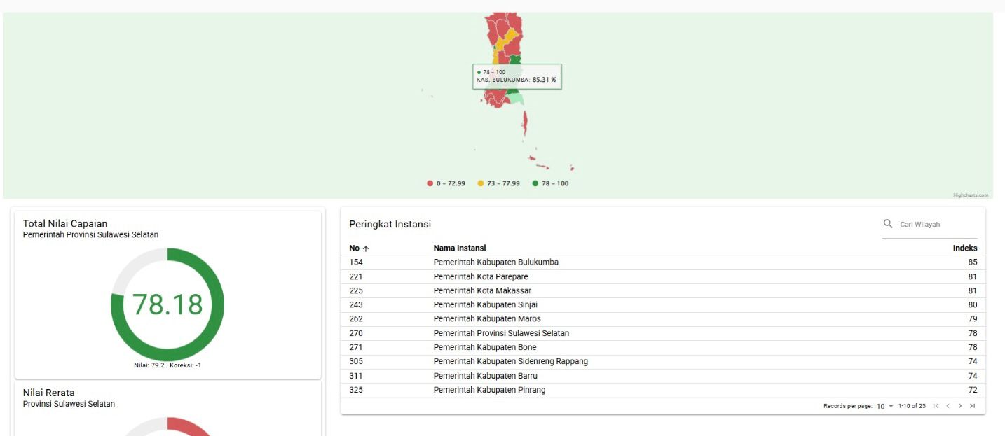 Berdasarkan hasil evaluasi tersebut, Kabupaten Bulukumba meraih nilai indeks 85,310 dan menempati peringkat pertama se-Sulawesi Selatan, melampaui Kota Parepare dan Kota Makassar yang masing-masing memperoleh indeks 81.