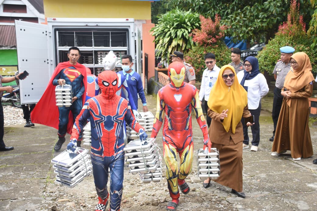 Sejumlah karyawan SPPG mengenakan kostum tokoh superhero dan karakter kartun, seperti Spiderman, Ultraman, Superman, dan Iron Man, untuk menambah keceriaan siswa, terutama di tingkat TK dan SMP.