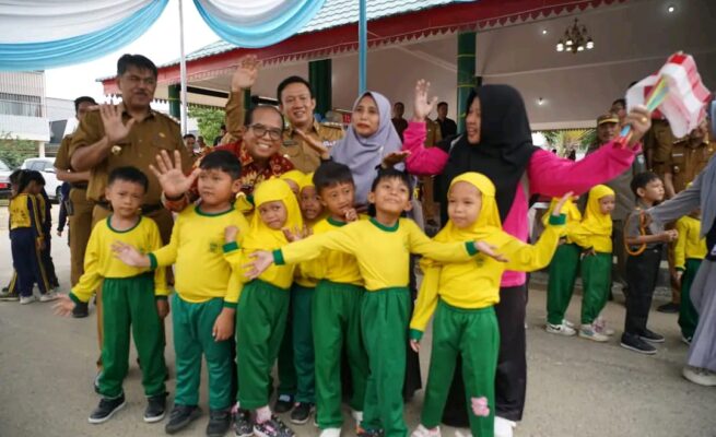 Pj. Gubernur Lampung Kunjungi Pringsewu, Main Bersama Anak PAUD hingga Letakkan Batu Pertama Masjid