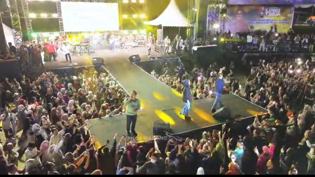 Suasana semakin semarak ketika Bupati Luwu Timur, Irwan Bachri Syam, naik ke atas panggung dan berduet langsung dengan para personel Wali.