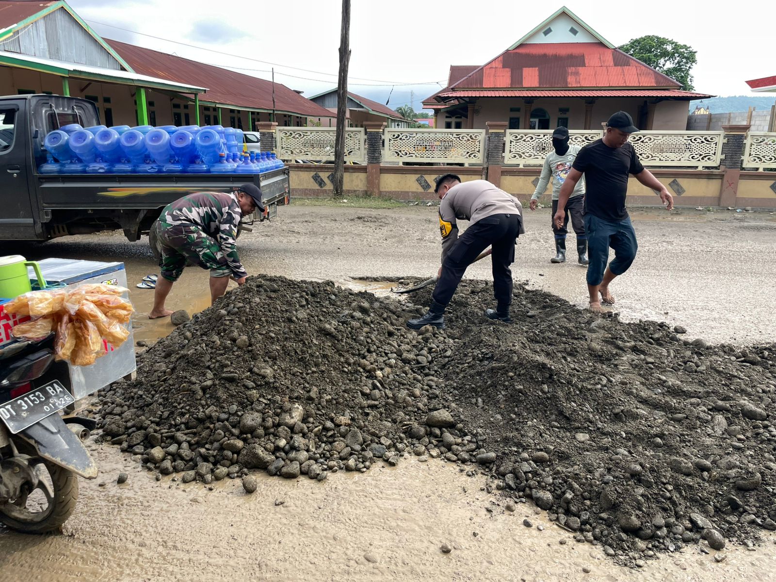 Proses penimbunan dilakukan secara gotong royong bersama Babinsa dan masyarakat, mulai dari pengangkutan hingga perataan material di lokasi jalan yang rusak.