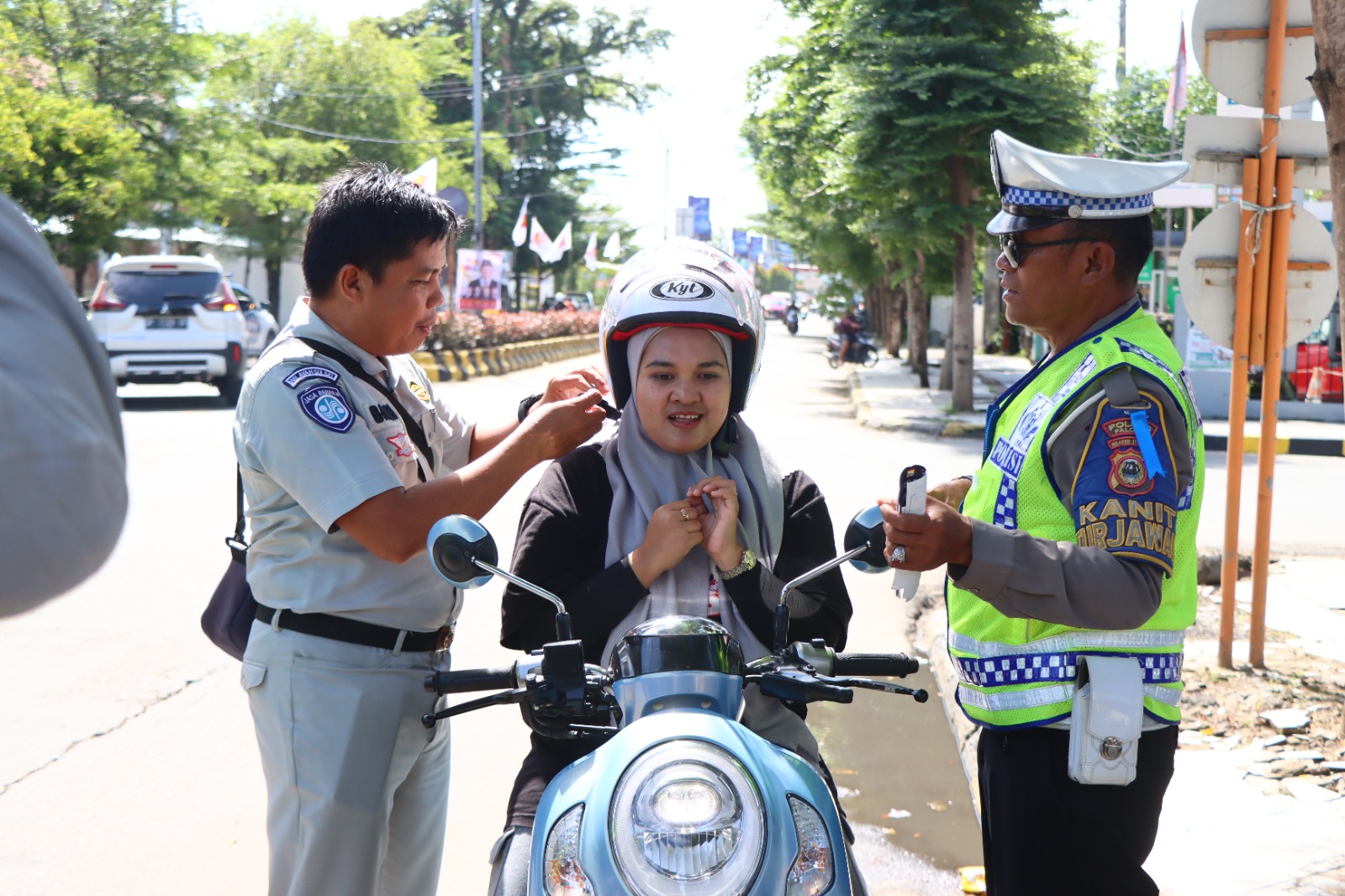 Pengendara yang melintas diberikan edukasi langsung mengenai pentingnya keselamatan berkendara, mulai dari penggunaan helm, kelengkapan surat kendaraan, hingga kepatuhan terhadap rambu lalu lintas.