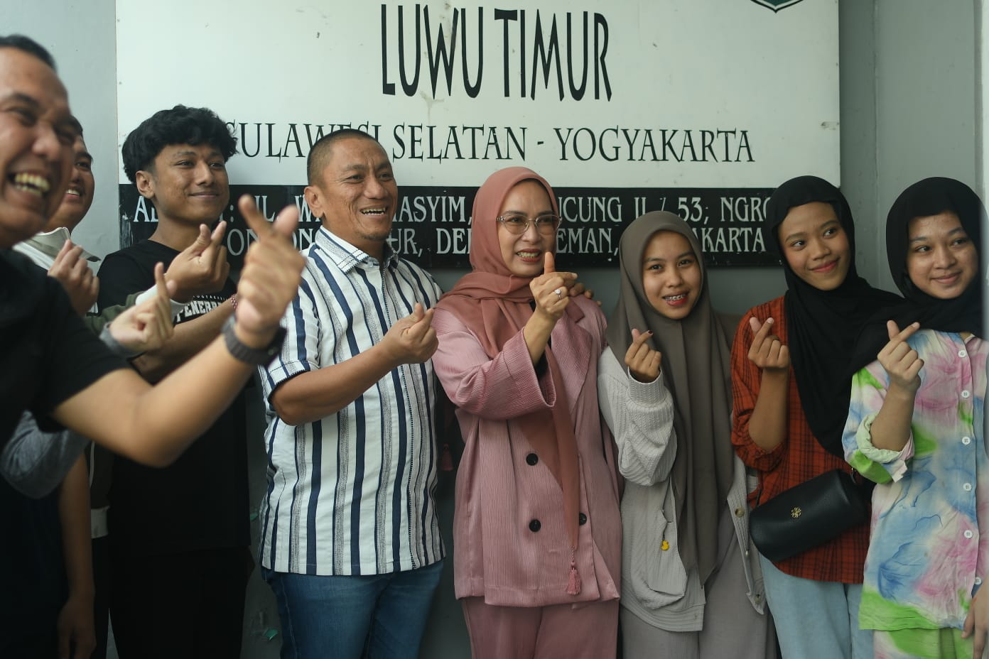 Bupati Luwu Timur Irwan Bachri Syam dan ketua TP PKK foto bersama dengan mahasiswa asal Lutim di Asrama Jogja. (ist)