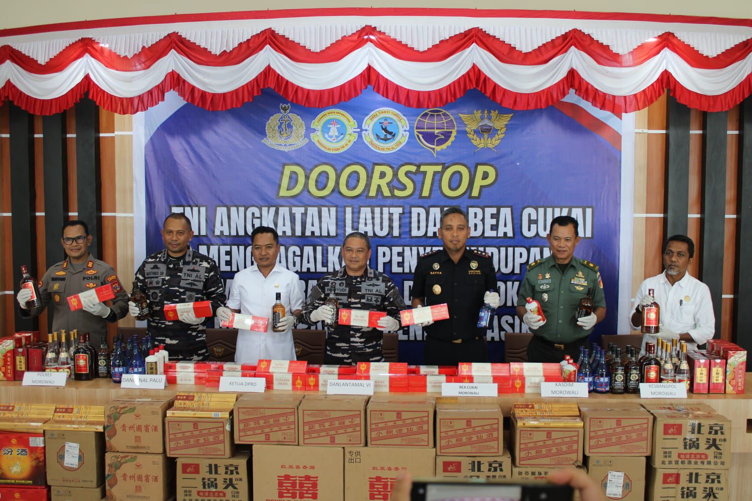 MOROWALI, TEKAPE.co – Pemerintah Kabupaten (Pemkab) Morowali melalui Badan Kesatuan Bangsa dan Politik (Kesbangpol) menghadiri konferensi pers terkait keberhasilan TNI Angkatan Laut (AL) dan Bea Cukai dalam menggagalkan penyelundupan minuman mengandung etil alkohol (MMEA) dan rokok ilegal di wilayah perairan Morowali.